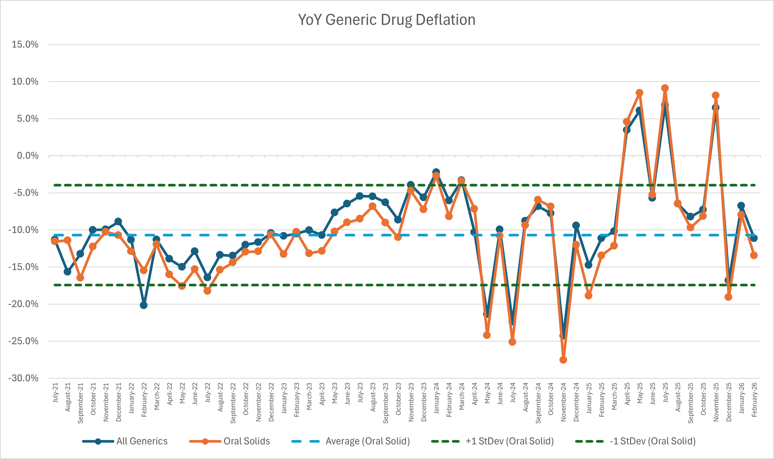 Ever since June 2020, we have been tracking year-over-year (YoY) generic deflation for all generic drugs that have a NADAC price. We once again weight all price changes using Medicaid’s drug utilization data. This past month, deflation on oral solid generics and all generics was at 11% and 9%, respectively (Figure 4). If you are a purchaser of generic drugs, an increase in this metric is ideal as it means costs are declining. This is right in line with the NADAC packed bubble chart, which also showed the cost of generic drugs decreasing. Businesses generally enjoy it when their input costs go down.