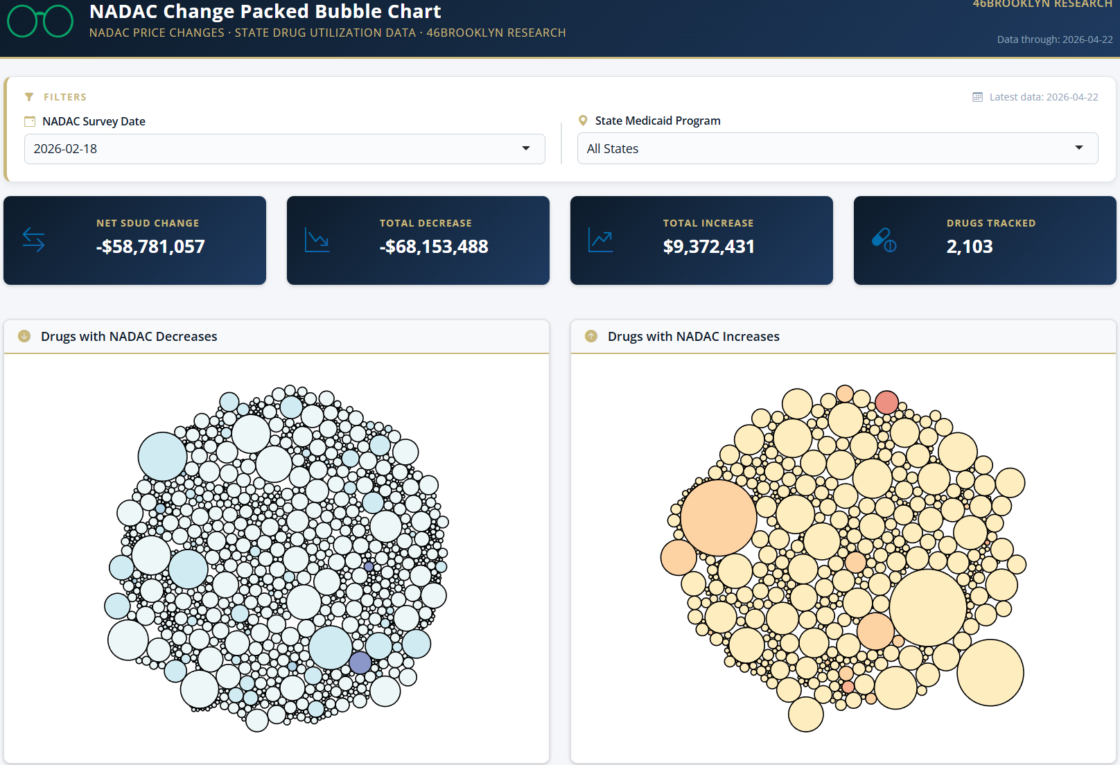 The blue bubbles on the left of the Bubble Chart viz (screenshot below in Figure 3) are the generic drugs that experienced a price decline (i.e. got cheaper) in the latest survey, while the yellow/orange/red bubbles on the right are those drugs that experienced a price increase. The size of each bubble represents the dollar impact of the drug on state Medicaid programs, based on utilization of the drugs in the most recent trailing 12-month period (i.e. bigger bubbles represent more spending). Stated differently, we simply multiply the latest NADAC survey price changes by aggregate drug utilization in Medicaid over the past full year, add up all the bubbles, and get the total inflation/deflation impact of the survey changes.